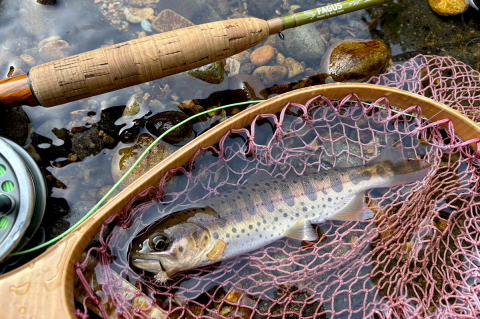 ロッドを振り始めるとすぐに釣れた綺麗な魚体のニジマス